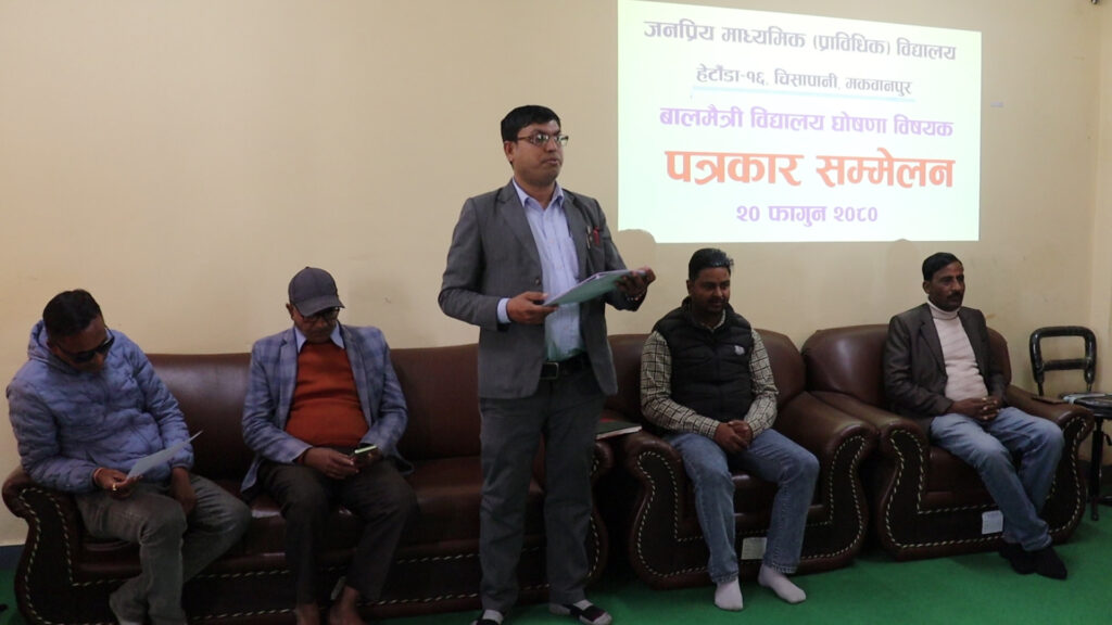 यस्तै, हेटौंडा १६ स्थित जनप्रीय माध्यामिक विद्यालय पनि २२ गते बालमैत्री विद्यालय घोषणा हुँदैछ । २२ गते बिहान ९ बजे नगर प्रमुख मिनाकुमारी लामाको प्रमुख आतिथ्यतामा विद्यालयलाई बालमैत्री विद्यालय घोषणा गरिने आइतबार पत्रकार सम्मेलन मार्फत् जानकारी गराइएको छ । घोषणा मात्रै नभएर दीर्घकालिन रुपमा कार्यान्वयनमा ल्याउन समेत विद्यालयले योजना बनाएको प्रधानाध्यापक भुपेन्द्र चौलागाईले बताउनुभयो । बालबालिकाको सर्वाङ्गिण विकास गराउन बाल अधिकारका क्षेत्रहरुलाई अक्षरशः पालना गर्नुपर्ने बताउँदै प्रधानाध्यापक चौलागाईले विद्यालयले बालमैत्री विदालयका सबै सूचक पूरा गरेको जानकारी दिनुभयो । गत आर्थिक वर्षको फागुन ६ गते बाल क्लब गठन सँगै विद्यालयले बालमैत्री अभियानको थालनी गरेको हो । बालमैत्री विद्यालय घोषणाको तयारीले शिक्षक विद्यार्थीमा सकारात्मक परिवर्तन आएको उहाँले बताउनुभयो । विद्यालयमा १ हजार ८ सय विद्यार्थी रहेका छन् । हेटौडा उपमहानगरका सामाजिक विकास संयोजक एवं १६ नम्बर वडा अध्यक्ष रामकृष्ण कोइरालाको प्रमुख आतिथ्यतामा पत्रकार सम्मेलन भएको हो । फागुन २२ गते नै हेटौंडा २ स्थित बालजागृती इग्लिस बोर्डिङ स्कुल पनि बालमैत्री विद्यालय घोषणा हुँदैछ ।