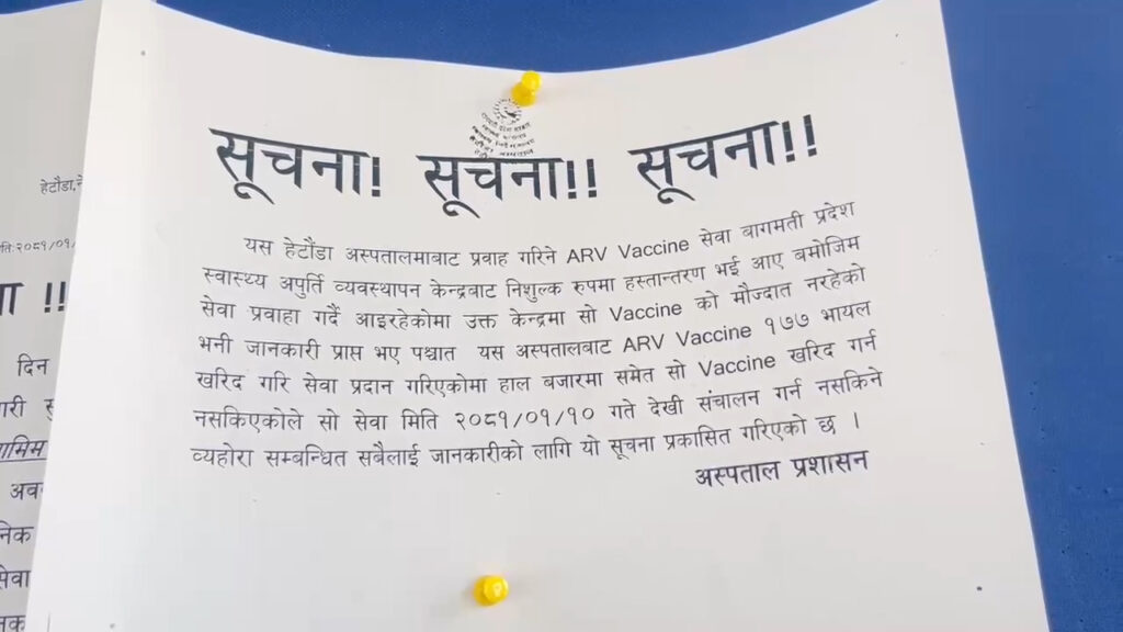 प्रदेश आपूर्ति व्यवस्थापन केन्द्रले खोप उपलब्ध नगराएपछि अस्पताल प्रशासनले सूचना टाँस गरेर खोप नपाईने जानकारी गराएको छ । निशुल्क पाउनुपर्ने खोप ब्यवस्थापनमा प्रदेश आपूर्ति व्यवस्थापन केन्द्र र हेटौँडा अस्पताल प्रशासन गम्भीर नबन्दा बिरामीहरुले समस्या झेल्नुपरेको उनीहरुको गुनासो छ । यता अस्पताल प्रशासनले भने खोप ब्यवस्थापनका लागि प्रदेश आपूर्ति व्यवस्थापन केन्द्रमा पत्राचार गरिएको दाबी गरेको छ ।