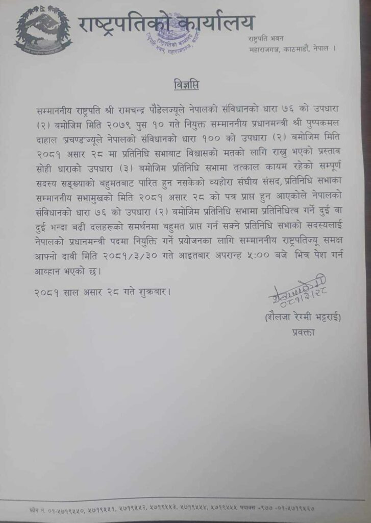 संविधानको धारा ७६(२) अनुसार प्रतिनिधि सभाको बहुमत पुग्न सक्ने आधारसहित प्रधानमन्त्रीमा दाबी गर्न राष्ट्रपतिबाट आह्वान भएको शीतलनिवासबाट जारी सूचनामा उल्लेख छ ।