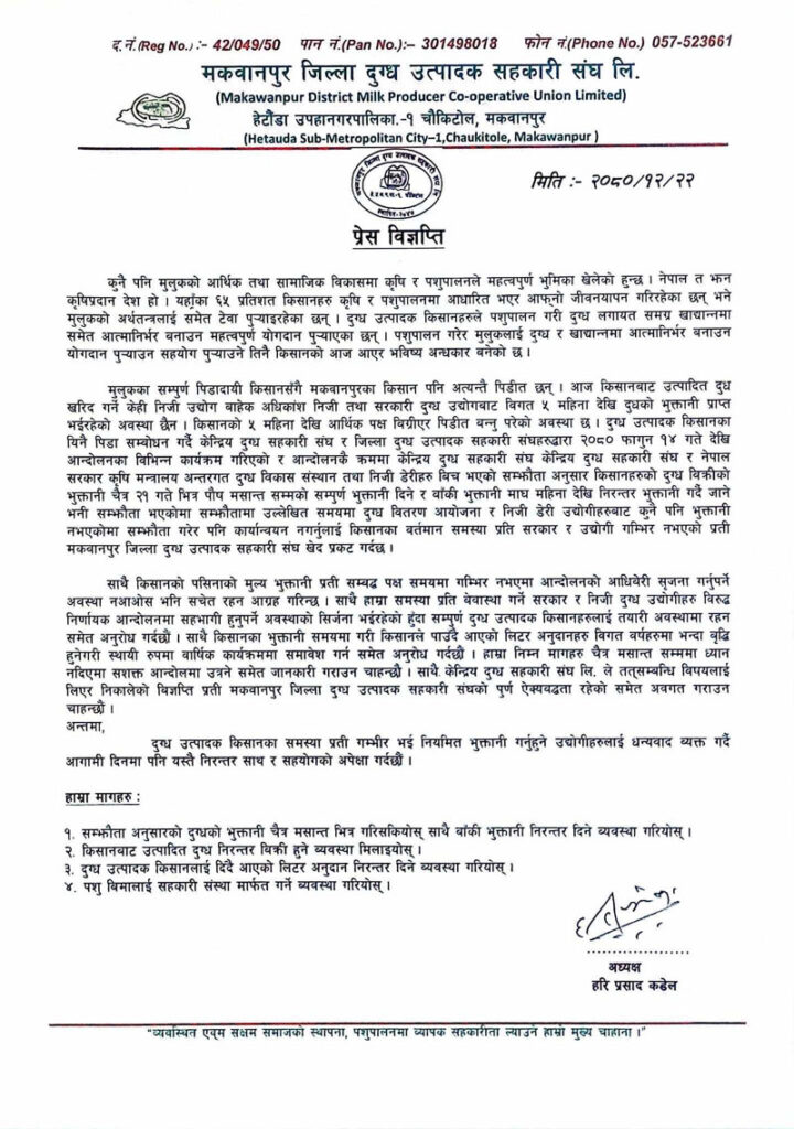 समयमै भुक्तानी नदिए आन्दोलन गर्ने दुग्ध संघ मकवानपुरको चेतावनी