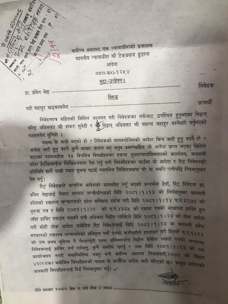 बागमती प्रदेशको स्वास्थ्य मन्त्रालयले डा. प्रबीण श्रेष्ठलाई हाजिर गरायो